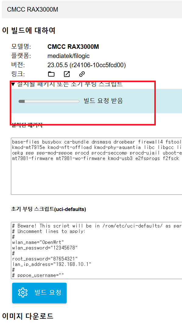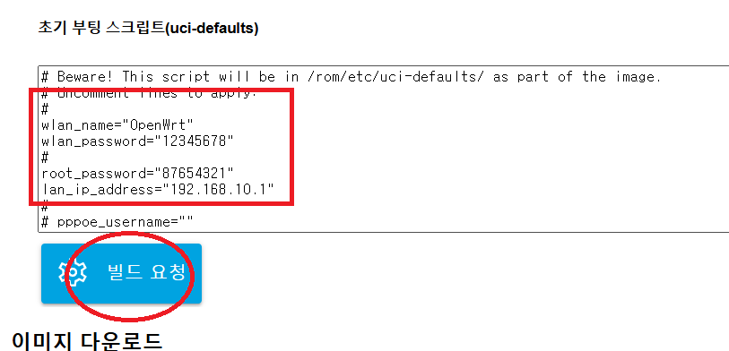 그후 커스텀 다운로드 밑 SYSUPGRADE를 받은뒤 사용하는 공유기에 빌드하면 끝이다.